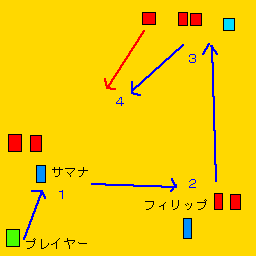 戦う順番はサマナと戦っているモビルスーツ2機から撃破する(地図の1)。その次はフィリップの敵2機である(地図の2)。その後、ロックするとミディア方面にモビルスーツが3機現れるのでその方向にダッシュする(地図の3)。その中で2機をミディアのそばで素早く撃破する。残りの1機はサマナに襲いかかるのでサマナの負担にならぬよう素早く撃破してやる(地図の4)。こうしてイフリートの登場を待つ。