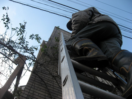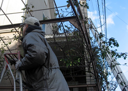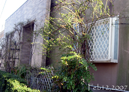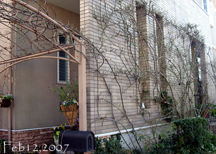 2007年最初の作業 1月に二度目の石灰硫黄剤散布 その後すぐに剪定誘引作業に入りました。 今年は記録的暖冬のため、芽の動きが早く、 2月11日、12日の連休で 最後まで残っていた北壁の薔薇たちの剪定誘引作業を行いました。