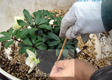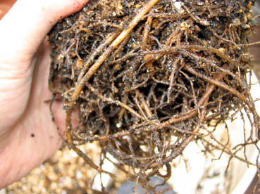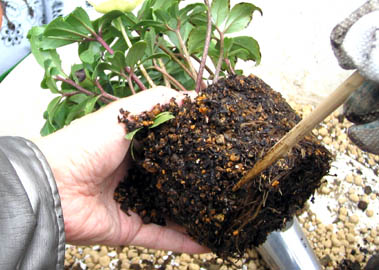| 根鉢を丁寧に、箸でほぐしていきます。 茶色く枯れた根があったら、 その上で切り取りましょう。 |
