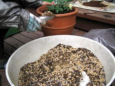 | 鉢のどのくらいまで土を入れるか、よく考えてください。 苗の真下に空間が空かないように、 苗を少し上から押し付けます。 |