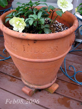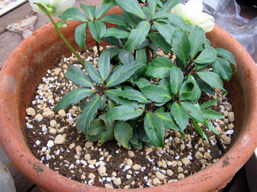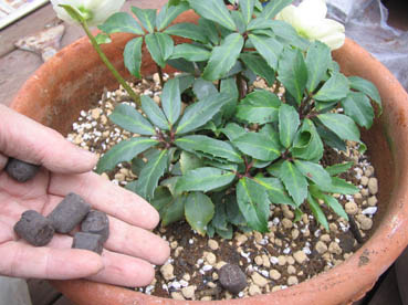 | 固形油粕肥料を少し、ばら撒きます。 | 鉢底は浮かします。 通気性排水性をよくするためです。 |
