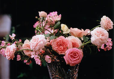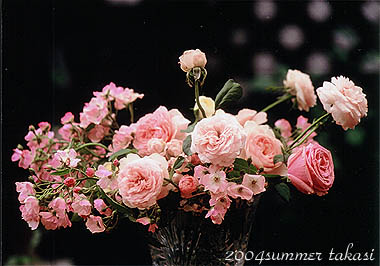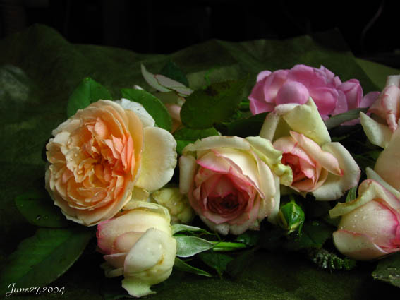 雨に濡れた薔薇たち 摘蕾を見落としていた薔薇なので、小さく咲いていますが 左はエブリン、中央はピエールドロンサール 後ろはチャールズレニ−マッキンットッシュ