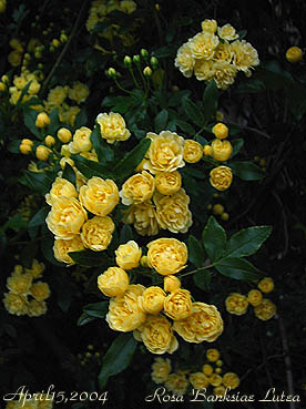 2004年のバラの幕開けを告げる黄モッコウバラ 3月27日 蕾がふくらんできました。 ふふふふ。 |