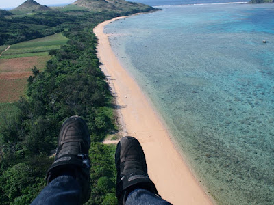 パラグライダー 引き返し、平久保崎付近でパラグライダー。 できるんだ。しかし、予定していた13時30分になっても迎えが来ない。焦り出した時、ボロいワンボックスカーが来た。姿を見て一発で私を把握したようですぐに声をかけて来た。 丁度私の前の客が着陸体制に入っていた。余裕で笑顔で着陸。 すぐに私の番。申込書に記入、誓約書に署名して、あれよあれよという間に着ている服の上からジャケット着て説明受けて離陸体制。緊張する間もなくテイクオフ。 浮いた。飛行機の離陸よりはゆっくり、それでもどんどん陸が遠くなって行く。飛行機に乗ると窓にかじりついてしまう私としては、遮るものの無いこの光景は最高の悦楽。