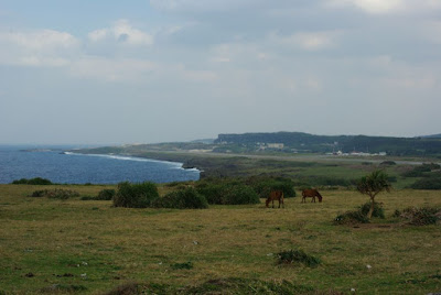 与那国島一周 まず与那国島を時計回りに一周。 集落を抜けると墓地。しかし,本州の墓地とは少し違っていて,墓は巨大。古墳のような墓が並ぶ。ただし,中には放置されて壊れたり草の中に埋まっているようなものもあった。 この墓地に向かう道は一直線なのだが,墓地直前で廃道状態になり通行止め,墓地への脇道に強制的に向かわされ,墓地が途切れる辺りで再び 先ほどの道の続きに戻るようになっている。一部分だけ廃道にした理由は何なのだろう? 墓地からしばらく走ると東崎。与那国島最東端の東崎は東牧場の中にあり,牛と馬が放牧されている。周囲に何もなく,眺めは素晴らしい。