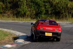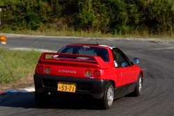 1コーナーのクリッピング付近。 まだステアリング切ってるし。 ブレーキングで向きを変えるなんて高度な技は私には使えません。 これだけロールしてもイン側のタイヤが接地してる。 狙いどおりの猫足です。 頭がちゃんと水平になっています。意識していないのに、偉い。 (自分で誉めてもむなしいだけ…) |