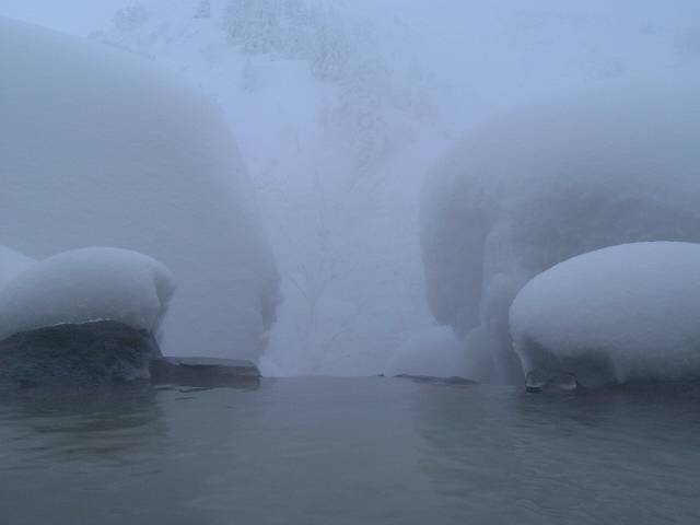 露天風呂です。露天風呂のすぐ外は崖になっており、写真で見える木々は崖の反対側斜面です。ただし、冬は雪がじゃまをしてさっぱり景色が見えません。 |