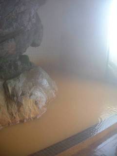 内風呂です。源泉が出ている場所はほぼ透明なんですが、湯船ではさび色になり、湯花がかなり混じっています |