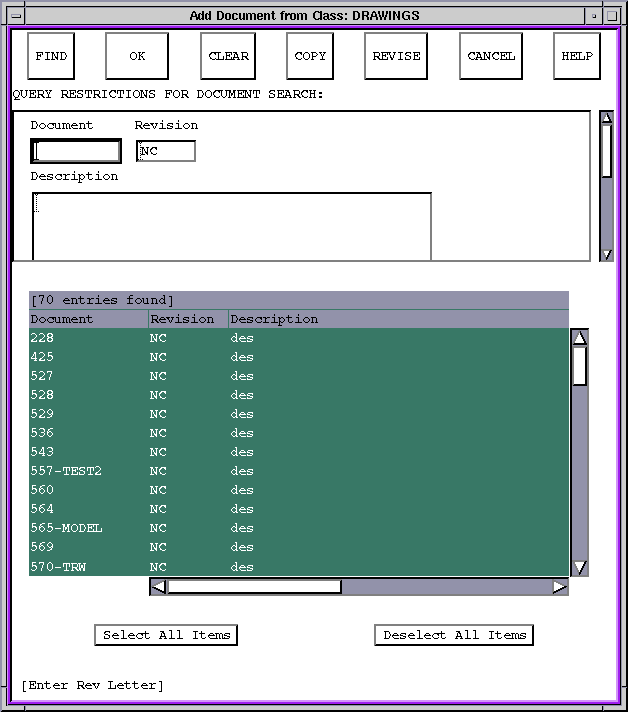 | Find - Finds documents based on a database query that corresponds with entries in the query restriction edit fields. Wildcards are allowed in these query fields. |