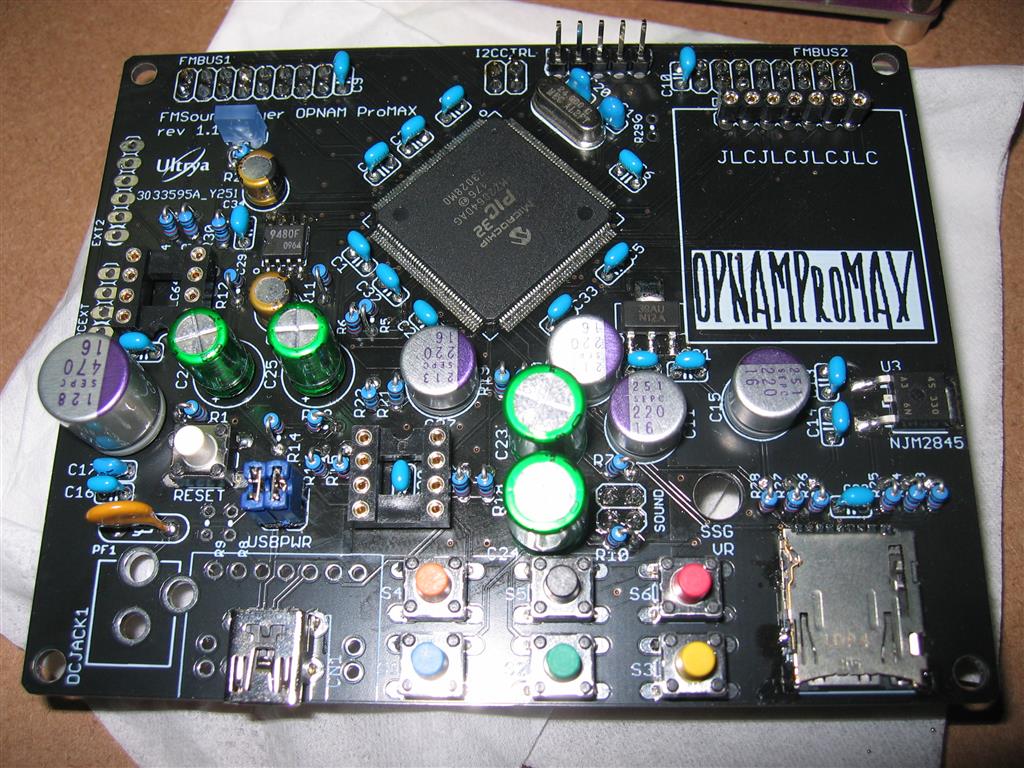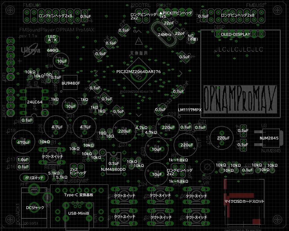 ・ファームウェアを更新したいです ブートローダーを利用して更新します。具体的には、以下の2種類の方法があります 1.PCとUSBで接続し、PC上で更新用のプログラムを実行する 2.SDカードにファームウェアをFIRMWARE.HEXの名前でリネームして配置して更新する OPNAMシリーズのS1ボタンとS2ボタンの両方を押しながらリセットボタンを押すことで、更新モードで起動します この状態でPC上で更新プログラムを実行するか、又はファームウェアファイルを入れたSDカードを挿入します ※USBで更新する場合、更新モードに入ってから10秒程度経過すると更新ができなくなります もう一度更新モードに入り直し、更新プログラムを実行してください ・SCCI/SCCI2モードを利用するためにはどうすればよいのでしょうか? OPNAMシリーズをUSBでPCに接続し、そのままPC側でSCCI対応ソフトや設定ソフトを起動してください 自動的にSCCIモードに切り替わります SCCIには、大きくNORMAL(音源構成固定製品用)、LIGHT(音源構成可変製品用)、SCCI2(最新仕様の音源構成可変)の3つがあります それぞれに対応しているため、設定メニューのSCCIでどの製品に対応するかを切り替えてください メニューで切り替えるほかに、起動してタイトル画面が表示されている間に、S1ボタンを長押しすることでも切り替えることができます ※それぞれの違いについてはSCCIについて調べてください ・一部のPCM曲の音量が小さいのですか PCM曲はデータそのものが音量を決定しています 設定で、 PCM > EXTRA PCM VOL を、EXTRA又はEX-LIGHTにして、音源別の音量調整を変更してください また、その音源全体でなく特定の曲だけが小さい場合、データを加工する必要がありますが、 曲データの作成者が小さいなと思っていた場合、曲データの中にあるボリューム調整用の設定を有効にしている場合があります この場合は、設定メニューの VOLUME > VOLUME MODIFIRE をENABLE(有効)にしてください ・サブディレクトリの曲が再生されません 設定メニューで切り替えできます PLAY > SUB DIR で有効、無効を切り替えてください サブディレクトリは、第一階層のディレクトリのみ対応しています (コンソールで制御する場合はこの限りではありません) #内部でシャッフル状態を覚えておくためのバッファのサイズによる制限です そのうちランダムシード値だけ覚えておいて、毎回ディレクトリスキャンすることで対応するかもしれません ・設定を初期化したい SAVE > CLEAR EEPROM を実行した後、リセットしてください その後メニュー画面を開き、設定を保存してください または、S2ボタンを押しながら電源を投入、またはリセットボタンを押すことで、既存の設定を読み込まず初期状態で起動します この後に、メニュー画面を開き、設定を保存してください ・設定をSDカードに保存したい SAVE > SAVE SD または SAVE > SAVE SD&EEPROM を使って、SDカードに設定ファイルを保存してください 次に、 ETC > EEPROM をONLYからOVERWRにしてください EEPROMメニューがONLYの場合は、EEPROMの設定しか使われません OVERWRは、SDカードにある設定ファイルで、現在の設定を上書きする設定になっています ※SDカード単位に設定を行いたい場合は、設定ファイルの利用をおすすめします ・PCMを高音質にしたい 1.一部のPCM再生について、サンプリングレートを限界まで引き上げる設定があります PCM2 > HIGH SAMPLE をHIGHにしてください かなり負荷が高くなるので、負荷軽減オプションを有効にすることも検討してください この設定が有効になる音源は SEGA PCM、C140、C352、SCC、???音源です 2.OLED表記の輝度を下げることで、電源ラインのノイズを減らすことができます DISPLAY > OLED HALFBR を有効にしてください 画面が常時暗い状態となりますが、OLEDの電源ノイズを減らすことができます 3.再生開始時にすべての曲データを読み込む PLAY > LOADALL を有効にしてください メモリに収まらないファイルの場合は再生できなくなり、スキップされます ・OLEDの焼き付きを防ぎたい DISPLAY > OLED SAVER の設定で、暗くするまでの時間を設定してください DISPLAY > OLED HALFBR の設定で常時暗くすることもできます ・OLEDが暗くなるのを何とかしたい DISPLAY > OLED SAVER の設定で、暗くするまでの時間を変更してください OFFにした場合は暗くなりません ・OLEDが消えている時にボタンを押したら操作がされてしまいました。まずは画面が復活してほしいです DISPLAY > OLED RESUME の設定で、SCREENに設定してください ボタンを押されたときに画面が非表示になっていた場合、ボタン操作は置いといていったん画面を復活させます。 改めて表示を見ながら操作してください ・本体のボタンを使わずに操作できますか ・コンソールでコマンド制御できますか USB接続することで、OPNAMシリーズはコンソールからコマンド制御することができます TeraTerm等を利用してください。 改行コードはLFのみなので、改行コード変換機能を利用して、LF→CRLF変換してください また便利なコンソール制御ツールを作成されている方も