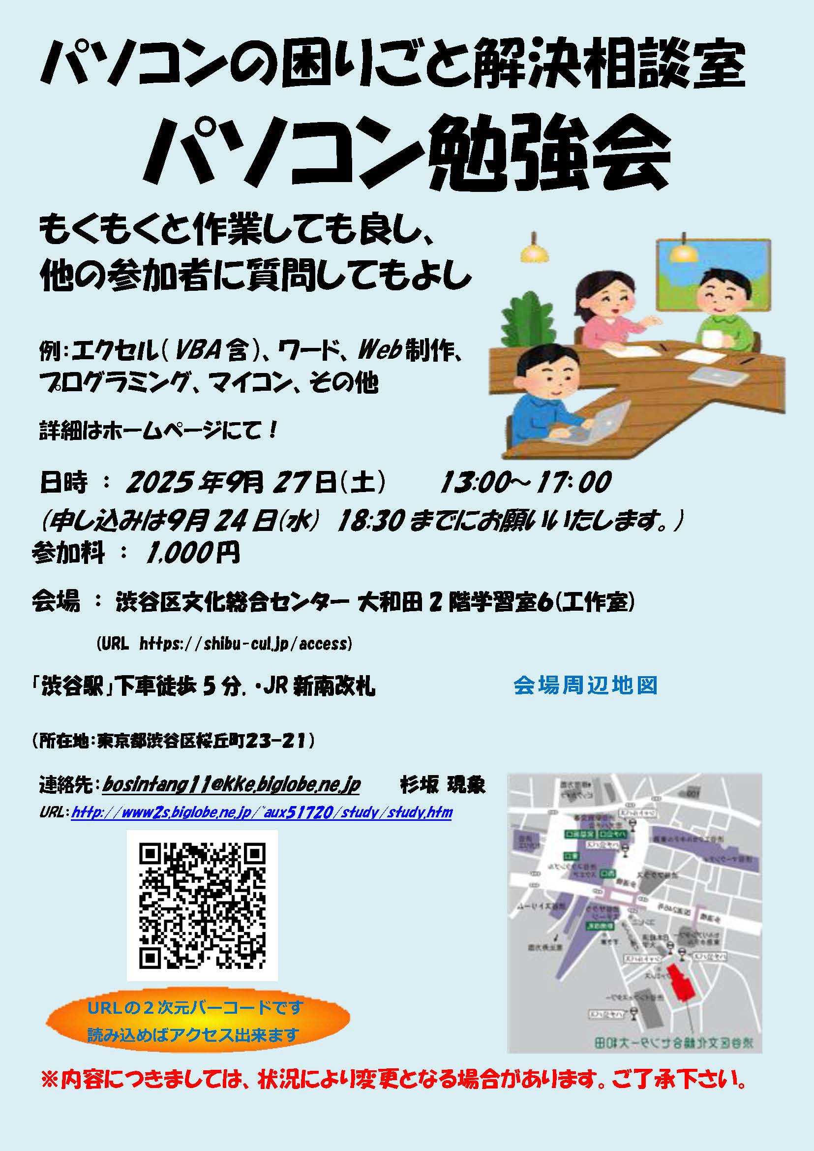 2025年9月27日(土)にパソコン勉強会を渋谷区文化総合センター 大和田2階学習室6(工作室) にて開催いたします。