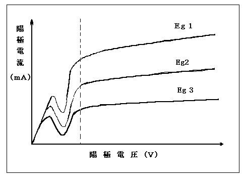 陽極電圧を増加すると陽極電流は図に示すようにはじめ急に増加するが、陽極電圧がある値以上になると 陽極電圧の増加に対して陽極電流は減少する。