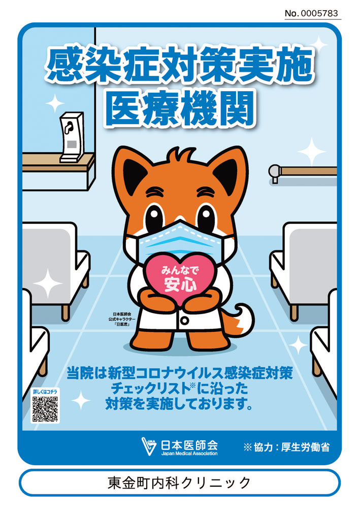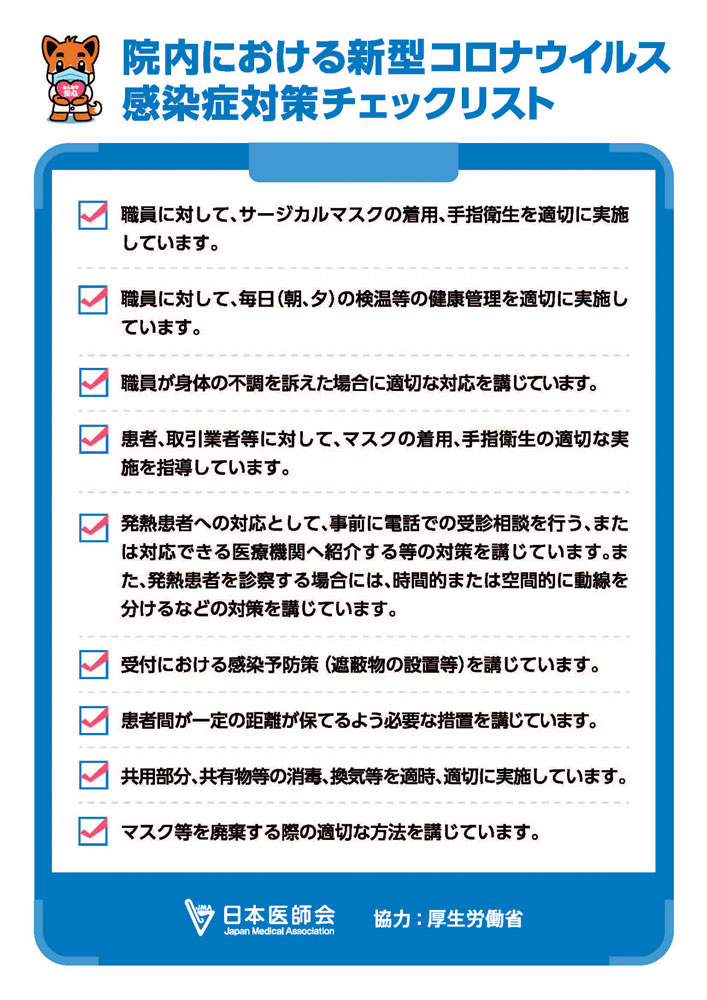 当クリニックでは新型コロナウイルス感染症を拡散させないよう、手指消毒やマスク着用など標準的な院内感染対策を適切に行っております。実際に院内感染は起こしていません。 |