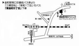 京成線金町駅出て目の前のバスロータリーより東武バスに乗り2つ目の東金町5丁目下車約1分。
