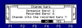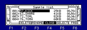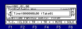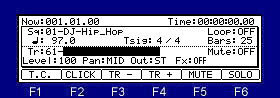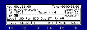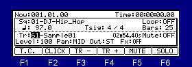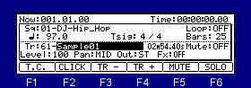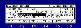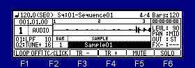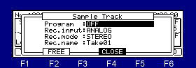 ![]() A sample is assign to a track and can play back. If you press the [REC]+[PLAY] or [PLAY START] key of can record. ![]() Track 61- 64 main screens. ![]() ![]() Please move cursor to the sample field. Please select a sample to playback by a DATA wheel. Selection of a sample can also be select from the window of "Sample list". Playback of a sample will be begun if [PLAY] or the [PLAY START] key is pressed. When the [PLAY] key is pressed, playback can be begun from the present time. Press the [STOP] key. will stop playback. Press the [WINDOW] key. The "Sample list" window will open. ![]() Playback is begun by the [PLAY START] key. ![]() ![]() Stops by 003.02.40 ![]() If the [PLAY] key is pressed, playback will be begun from 003.02.40. Note: An audio track is not pronounced in song mode. ![]() ![]() Please move cursor to the track field and press the [WINDOW] key, the window of "Sample Track" will open, ![]() ![]() Program: The sound of a pad sound is decided. Rec.input: Select the recording sourec. Rec.mode: Selection in recording mode Rec.name: Sample name. (Default is "Take01.02.....") If F2 (FREE) key is pressed, the window of "Free sample memory" will open. ![]() ![]() Memory: The present free memory size Time MONO: Time which can be recorded by a monophonic recording. Time STEREO: Time which can be recorded by a stereo recording. ![]() ![]() When the [REC]+[PLAY START] key is pressed, recording is started from 001.01.00.