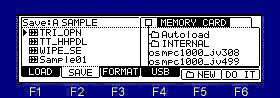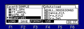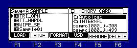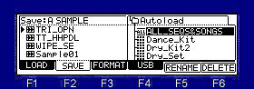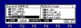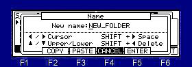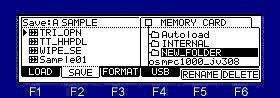 ![]() Note The total of the item (file and folder) that can do save in one folder is the maximum and is "1000". Therefore, please do not save the file of 1000 or more to one folder. When the file of 1000 or more is saved, it is not saved correctly. Moreover, even if it carries 131GB or more of HDD, it is recognized only to 131GB. ![]() Please move cursor to the device field and choose a save place. When you save to a folder, please move cursor to the folder of a save place and open a folder. Next, when you select the type of a save in the "Save" field and you save a file, please choose a file and press F6 (DO IT) key. Example: When "Sample01" is saved to the "Autoload" folder of the above figure ![]() Cursor is moved to a "Autoload" folder using ![]() Next, please press the ![]() ![]() ![]() Next, cursor is moved to "Sample01" of a left screen. ![]() ![]() If F6 (DO IT) key is pressed, "Sample01" is saved to a "Autoload" folder. ![]() ![]() If a save is completed, "Sample01" will be displayed on a right screen and it will blink twice. Note: The audition of the sample to save can be performed in OS1 and OS2. ![]() When cursor is in the device field, if the WINDOW key is pressed, the window of "Property" will open. ![]() ![]() ![]() ![]() If F5( ![]() ![]() ![]() Please decide the name of a folder and push F5 (ENTER). ![]() ![]() A new folder is created. |