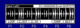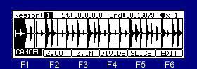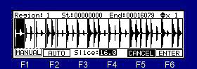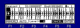 ![]() ![]() If F5 (CHOP) key is pressed, it will change to CHOP mode. ![]() ![]() The sample sliced by 16 is displayed. When cursor is in the region field, a region can be chosen by a DATA wheel. Moreover, selection of a region can be performed even if it turns a jog, pressing ![]() ![]() The start point of a region is adjusted in the "St" field, and the end point of a region is adjusted in the "End" field. The region chosen if F4 (DIVIDE) key is pressed is divided into two. ![]() When you change the number of slices, please press F5 (SLICE) key. ![]() ![]() A turn of a DATA wheel will change the number of slices. (2-64) The slice of the value changed when F6 (ENTER) key was pressed is determined. If F2 (AUTO) key is pressed, it will slice according to the value of level. (Notes: The sample for 20 seconds or more cannot AUTO.) ![]() ![]() Please turn a DATA wheel and set up level.